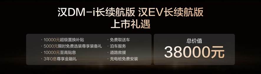 此次,漢DM-i長續航版共推出4款車型,補貼后售價15.98萬~18.98萬元;漢EV長續航版共推出3款車型,補貼后售價17.38萬~20.58萬元(10月31日前完成購車可享1萬元超級置換補貼)。同時,比亞迪還為用戶準備了包含置換補貼在內的至高價值3.8萬元七大禮遇。
