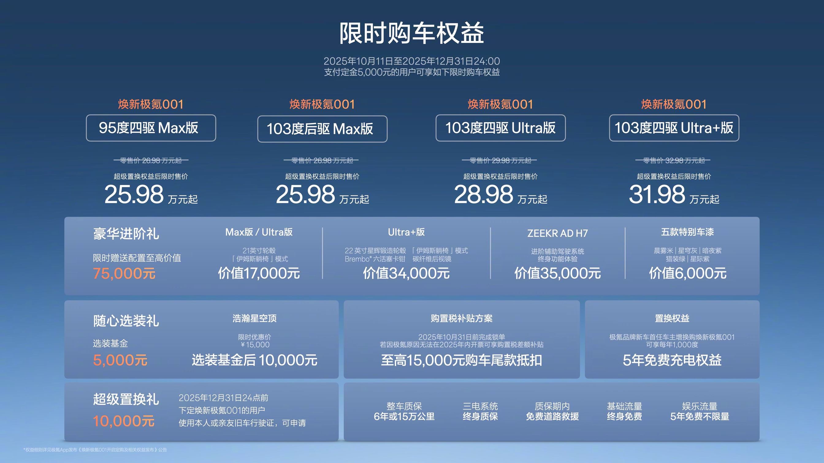 煥新極氪001價(jià)格出來(lái)了,雖然標(biāo)價(jià)是26.98萬(wàn)元起,但算上超級(jí)置換禮,就是25.98萬(wàn)元起步。如果是預(yù)訂用戶還有5000元的定金膨脹,價(jià)格就來(lái)到了25.48萬(wàn)元,基本和小米YU7持平。