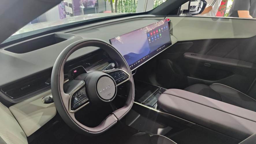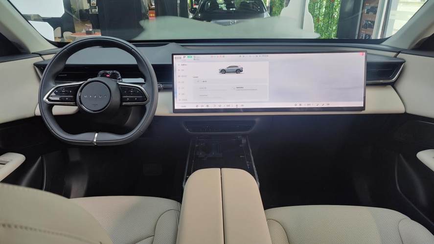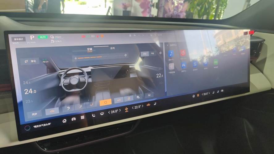 座艙的配備比想象中還要更好一些,全系包括四個增程配置、兩個純電配置,都標(biāo)配了這塊26.5英寸的大連屏,而且是一塊整體切割的液晶屏,而不是拼接的。中控臺上方的搪塑雖然手感不算出色,但至少也是略軟。普通版本的配置,內(nèi)飾的顏色搭配是很經(jīng)典的米加黑,看起來更簡潔,而頂配的Max版會加入對比更強烈的紫色,使得觀感更豪華。