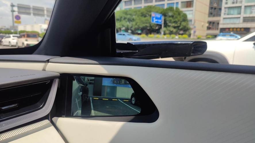 車門上的塑料面板印有縫線紋路來“以假亂真”。一個全系標(biāo)配的50英寸HUD取代了傳統(tǒng)儀表盤,使用全白色字體,清晰度尚可,但容易受到強光干擾。另外,外后視鏡的外圍面積偏小,比較難看清外側(cè)車道。