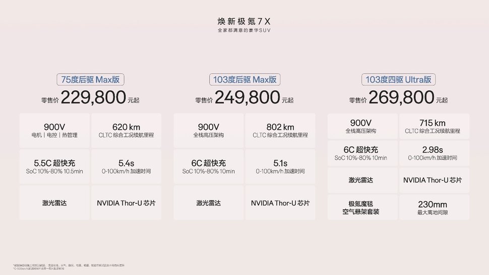 煥新極氪7X在高價值、好口碑的基礎上,在空間、性能、安全、智能四大維度豪華進階,全系搭載900V電機、電控及熱管理系統,全系標配5.5C或6C超快充,全系標配激光雷達及算力高達700TOPS的Thor-U輔助駕駛芯片,全系標配137項豪華配置,重塑全球家庭豪華SUV新標桿。
