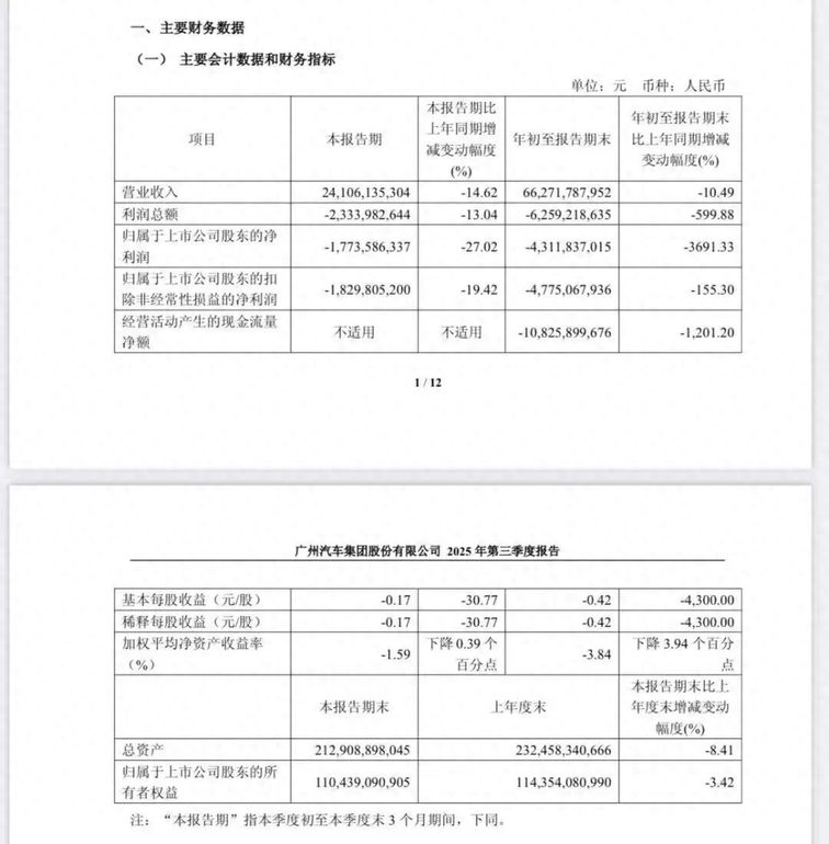 在實施“番禺行動”約一周年之際,廣汽集團交出了一份令外界瞠目結(jié)舌的財報。廣汽集團10月24日披露的數(shù)據(jù)顯示,今年第三季度,廣汽集團營收241.06億元,同比下降14.62%;歸母凈利潤為-17.74億元,同比下降27.02%;扣非歸母凈利潤為-18.30億元,同比下降19.42%。