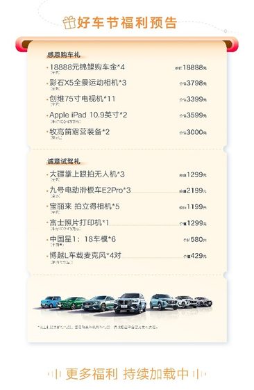 為滿足消費者便捷購車需求,吉利汽車打造直播購車狂歡專場。11月1日至11月14日,抖音吉利中國星直營空間、抖音吉利汽車官方賬號及吉利汽車天貓旗艦店將同步開啟直播盛宴。用戶只需在直播間完成留資預約試駕,即可免費參與 18888 元錦鯉購車金抽獎,中獎金額可直接抵扣購車款;此外,無人機、運動相機、iPad、滑板車等海量實用好禮將每日輪番派送,讓 “足不出戶享優惠”成為現實,持續為消費者送上購車驚喜。