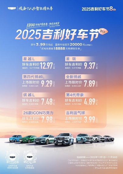 11月1日至11月30日,以“感恩1800萬用戶”為核心的第8屆2025吉利好車節正式啟幕。作為吉利汽車年末規模最大的購車盛事,本屆活動延續“好品質、好價格、好福利”核心主張,集結中國星、博系、繽系、豪系等主力燃油車型矩陣,通過超低價購車、多重補貼疊加、全平臺福利派送以及線下狂歡等多元回饋形式,為全國消費者帶來一站式高價值購車體驗,以實打實的優惠與服務,致謝千萬用戶多年來的信賴與陪伴。