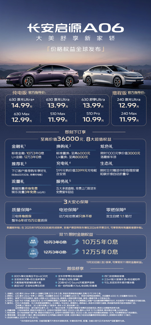 為回饋用戶支持,長安啟源還推出多重購車禮遇,下訂即可享受8大超值權益,至高價值36000元。雙11活動之際,長安啟源還特別針對11月30日前鎖單的用戶,升級了限時金融權益,購車可享10萬5年0息;其中630激光Ultra+車型更可享12萬5年0息!