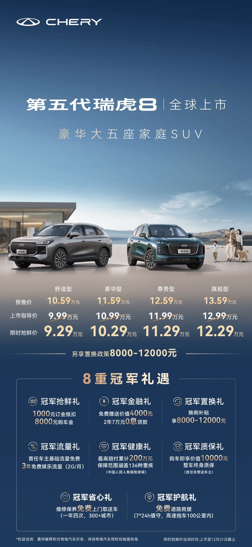 為讓更多家庭輕松擁有“冠軍SUV”,第五代瑞虎8推出極具吸引力的價格政策與“8大冠軍禮遇”。限時搶鮮價9.29萬元起,堪稱“十萬級燃油天花板”。