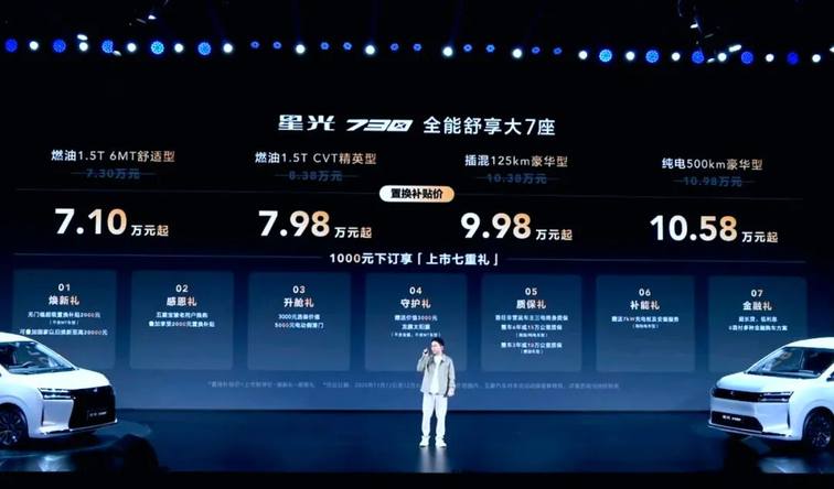 新車攜燃油、插混、純電三種動力,共4款車型而來,售價區間為7.3-10.98萬元,再加上官方給出的多重政策與置換補貼,入門價直接來到了7.1萬元,顯然更香了。下面,就和圈哥一起來解鎖這款“全能舒享大7座”MPV吧!