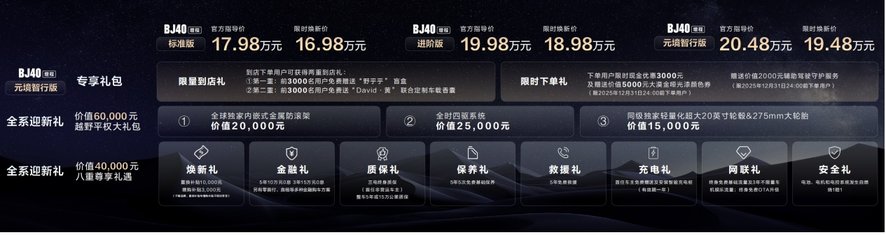 自此,BJ40增程家族一共擁有標準版、進階版、元境智行版三個版型。北京越野還帶來了BJ40增程三個版型均能享受的兩大全系迎新禮。