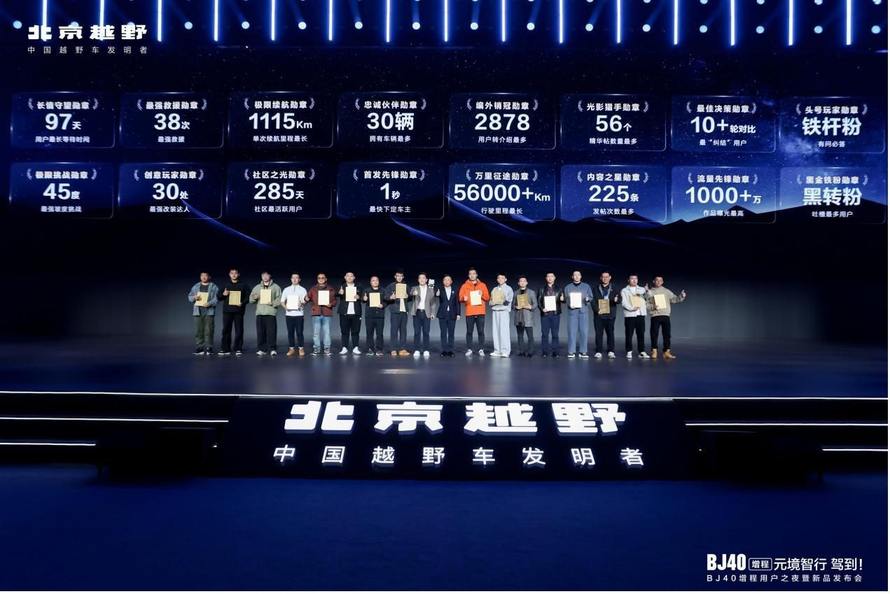 北汽集團董事長張建勇為BJ40增程“車主之最”用戶頒獎。16位獲獎用戶包括等車時間最久用戶、行駛里程最長用戶、一箱油單次跑出最遠里程用戶等,他們用一個個動人的故事,讓BJ40增程不僅僅是一臺車,更成為一種文化,一種精神符號。