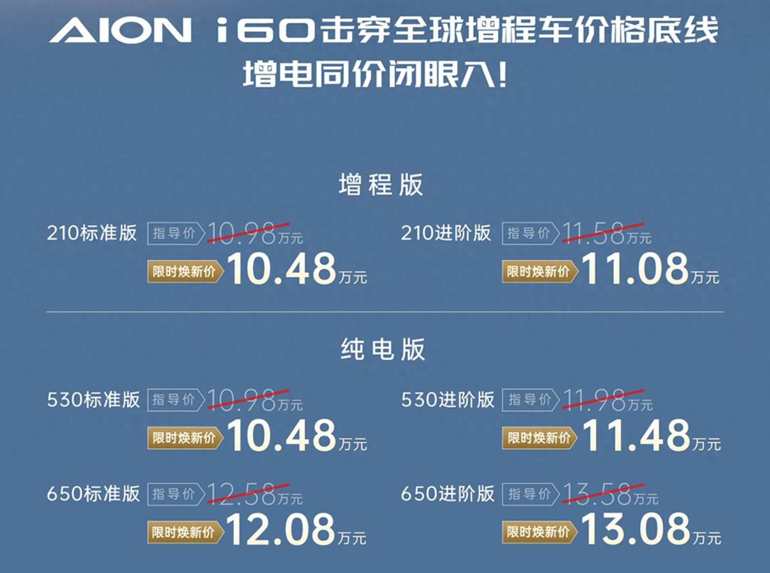 11月16日,廣汽AION旗下一款全新緊湊級SUV——AION i60正式上市,一共6個版本,其中純電版4款,增程版2款。增程版兩款車型售價分別為10.98萬和11.58萬元,置換補貼價后分別為10.48萬和11.08萬元。純電版4款車型價格區間從10.98萬到13.58萬元,置換補貼后降5000元,從10.48萬到13.08萬元。