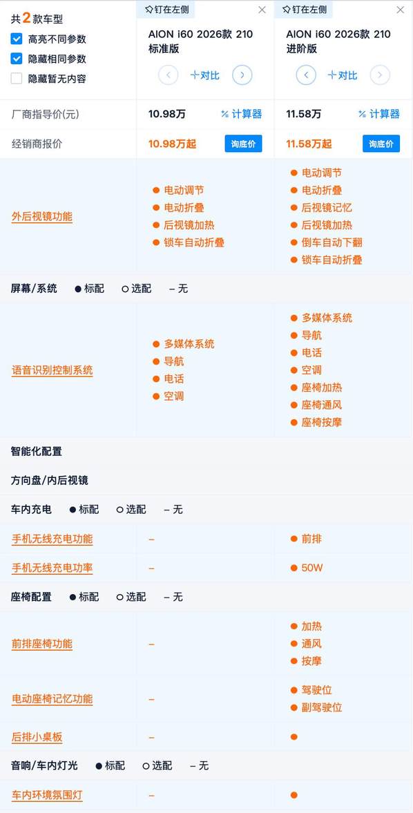 10.98萬起的SUV 埃安i60增程版兩款車型配置對比 家用誰更合適?