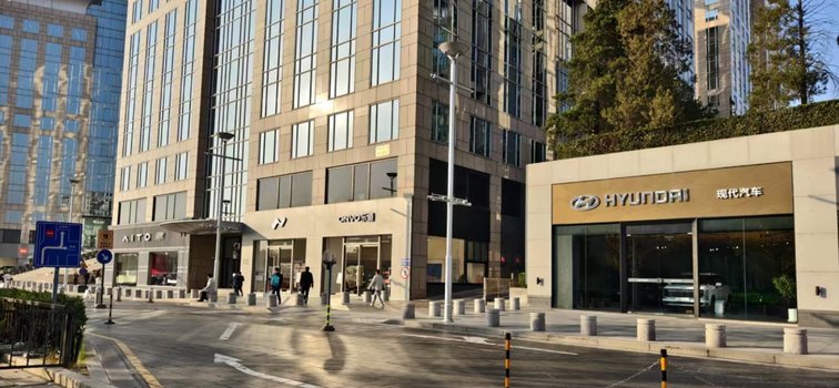 在北京王府井面向長安街的一側商鋪,現在幾乎都已被各家汽車門店包攬。包括蔚來、樂道、小米汽車、AITO問界、現代汽車等直營店,還有紅旗金葵花旗艦尊享中心。