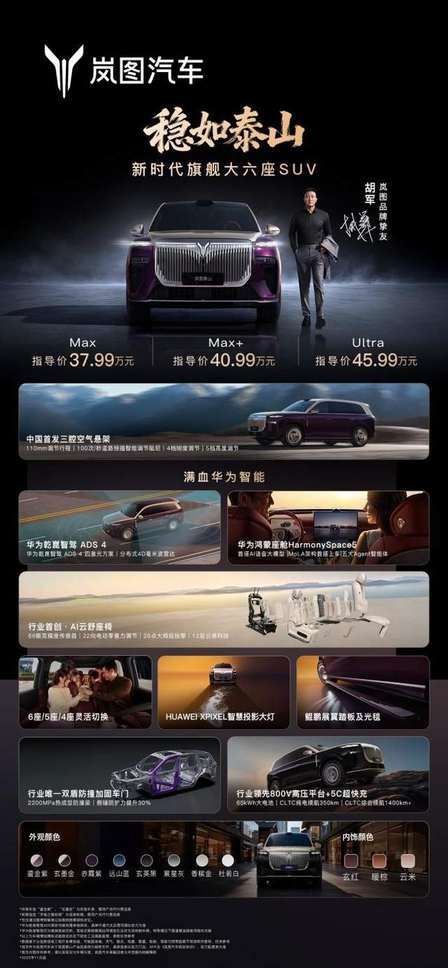 【2025年11月18日,深圳】11月18日,備受關注的大六座旗艦SUV車型嵐圖泰山在深圳正式上市,價格從37.99萬到50.99萬,包括 Max版、Max+版、Ultra版、黑武士版四個版型,同時嵐圖還公布了價值4.8萬元的限時上市尊享權益。