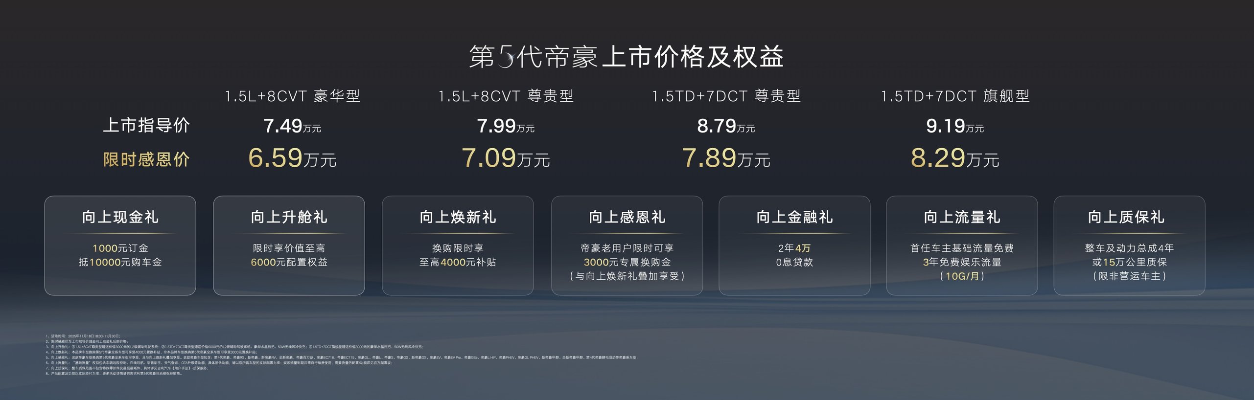感恩400萬,榮耀新篇章。第5代帝豪即日起推出7重上市禮遇,2025年11月30日前購車用戶,可享包含1000元訂金抵10000元購車金的向上現金禮;限時享價值至高6000元配置權益的向上升艙禮;換購限時享至高4000元補貼的向上煥新禮;帝豪老用戶可享3000元專屬換購金的向上感恩禮(與向上煥新禮疊加享受);2年4萬0息貸款的向上金融禮;首任車主基礎流量免費,3年免費娛樂流量(10G/月)的向上流量禮;整車及動力總成4年或15萬公里質保(限非營運車主)的向上質保禮。除此之外,作為帝豪持續越級向上,給用戶帶來超越期待體驗精神的延續,用戶還可選裝千里浩瀚輔助駕駛H3方案。第5代帝豪首次將包含行車、泊車、安全三大維度的高階輔助駕駛系統帶入8萬級燃油車型,擁有最高支持120km/h剎停的AEB急剎避險功能和同級唯一AES主動緊急避讓功能,為用戶提供“沃爾沃”式安全感,真正做到“科技平權、油電同智”。