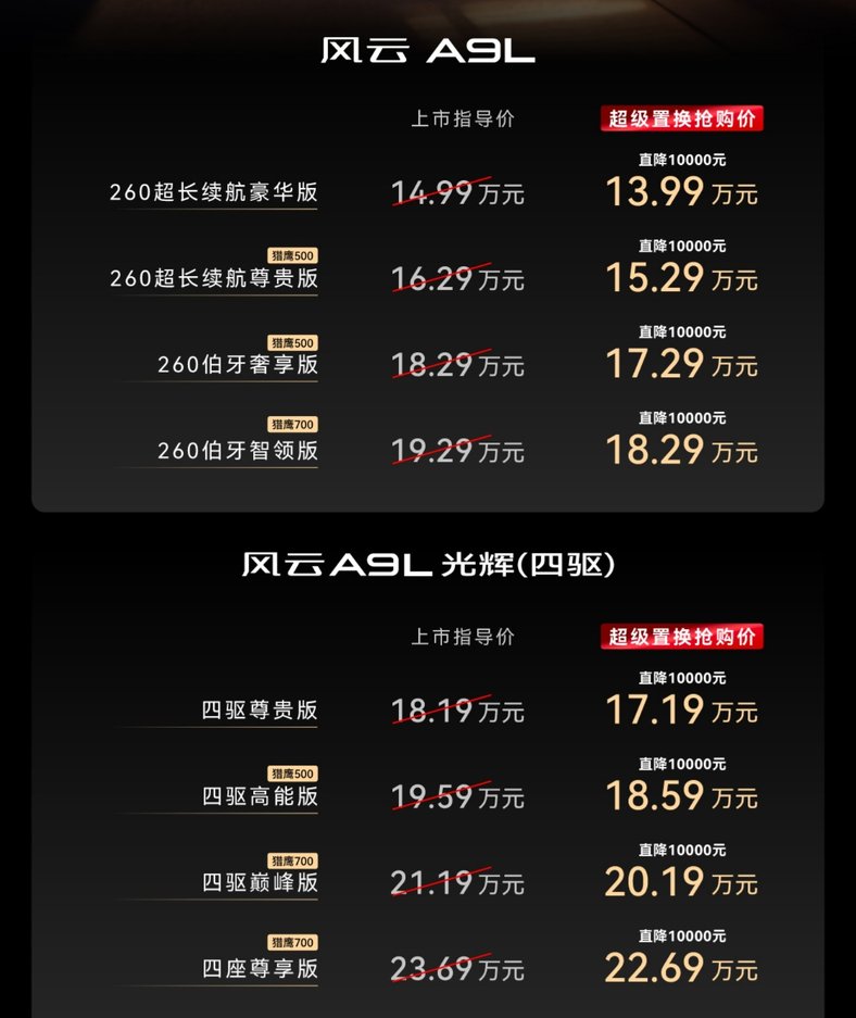 11月15日,風云A9L光輝(四驅)全球上市發布會在在重慶舉行,本次新車共推出四款版型,新車超級置換搶購價為17.19萬元—22.69萬元,新車根據版型不同分別搭載獵鷹500和獵鷹700。